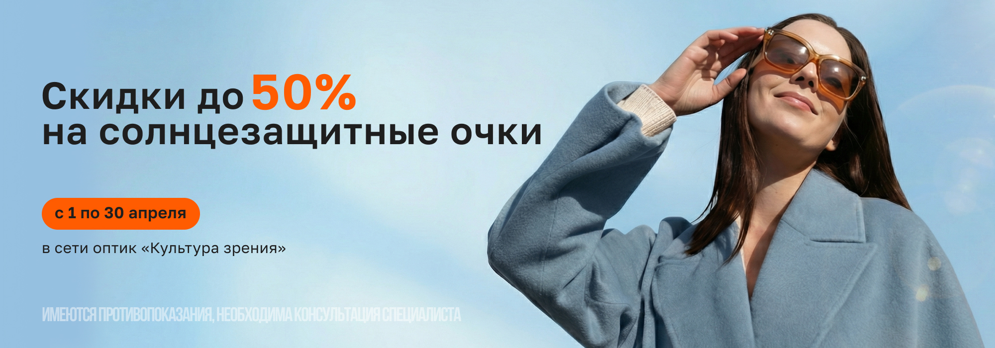 До 30 апреля в салонах оптики «Культура зрения» действует весенняя акция скидка 50% на весь ассортимент солнцезащитные очки.
